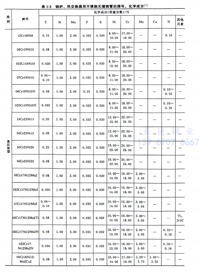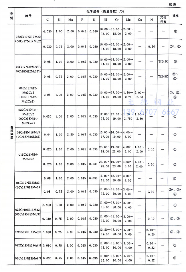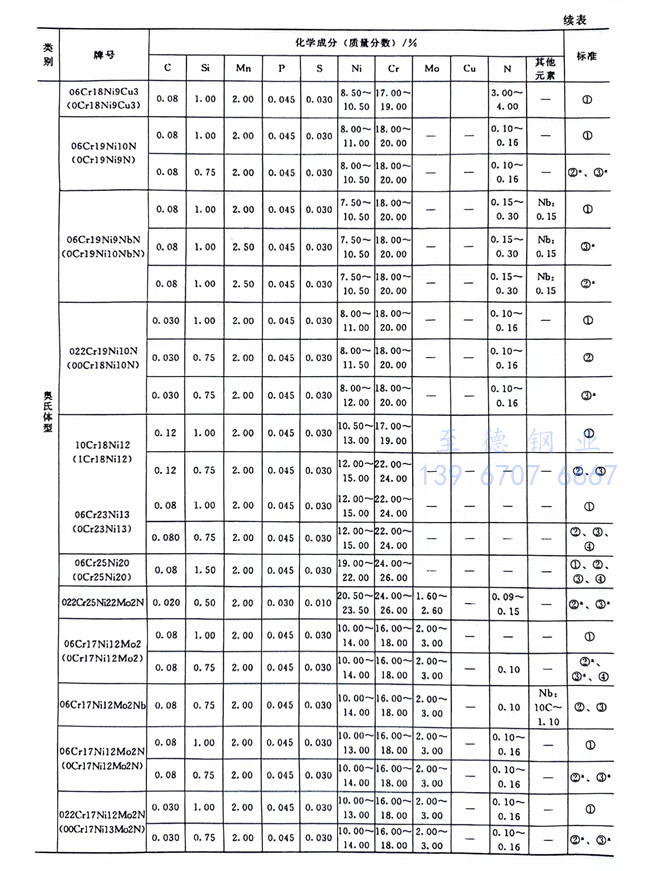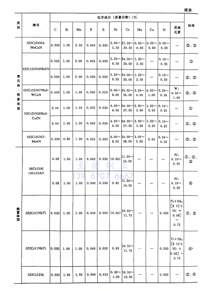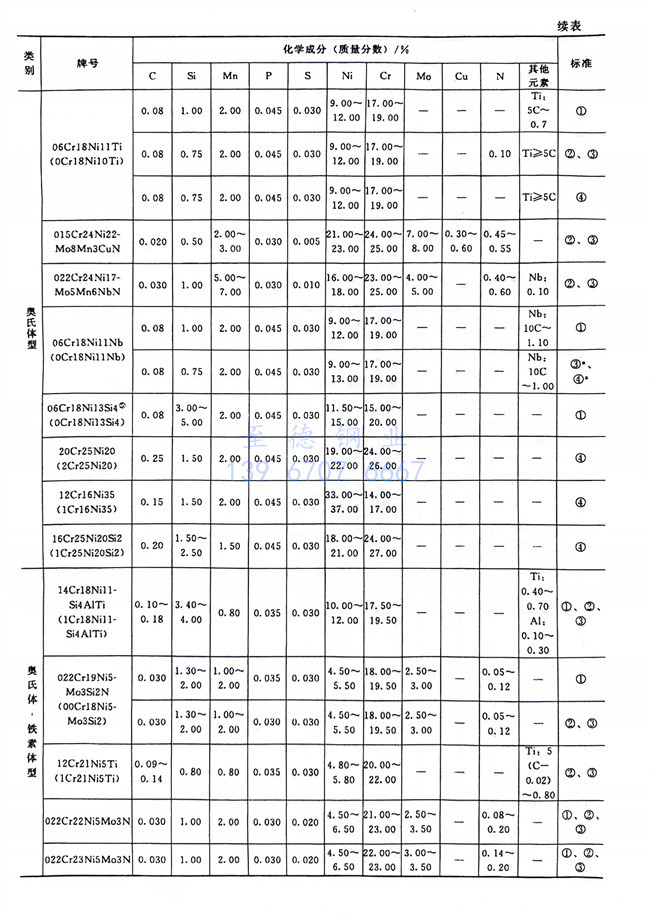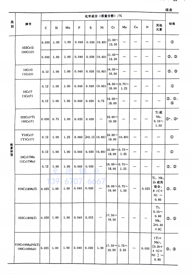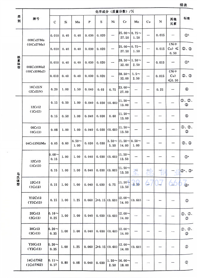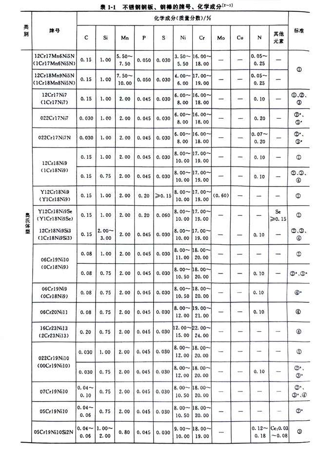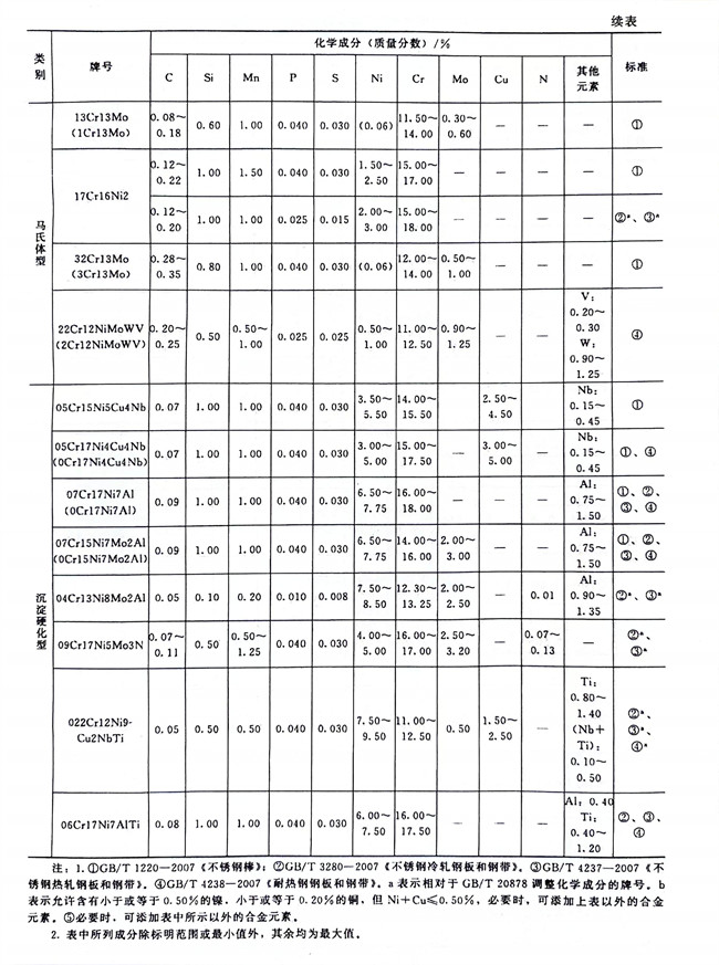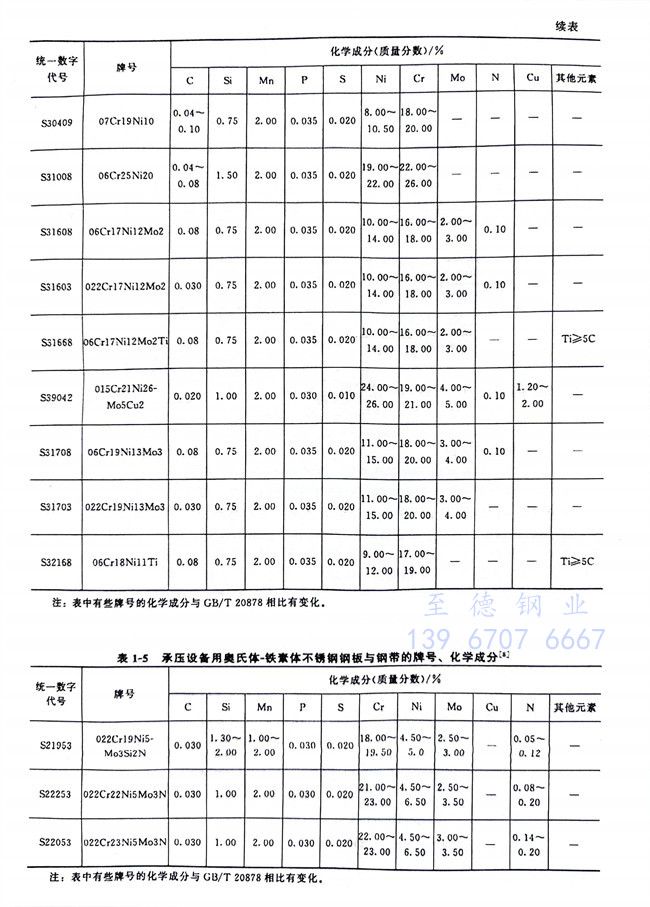 從表1-1~表1-6、表1-8可以看到,不銹鋼和耐熱鋼相互之間的許多牌號的化學成分、力學性能等是相同的,這些牌號的材料既可作為不銹鋼使用,也可作為耐熱鋼使用。
