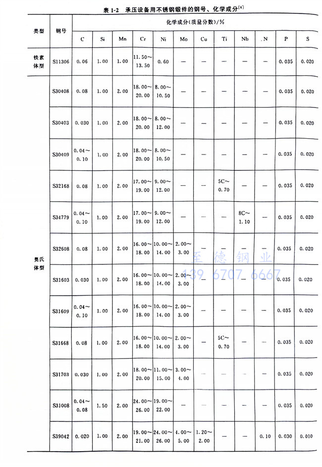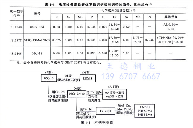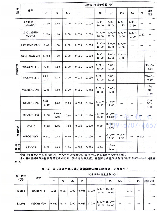 我國至少已制定了62項不銹鋼管材料標準(其中國家標準38項,冶金行業標準16項,航空航天標準6項、機械行業標準1項、能源局標準1項),每個標準均規定了材料的化學成分、力學性能等技術要求。在機械工程上應用最多的不銹鋼材料與標準包括GB/T3280-2007《不銹鋼冷軋鋼板和鋼帶》(該標準正在修訂中)、GB/T 4237-2007《不銹鋼熱軋鋼板和鋼帶》(不得用于鍋爐壓力容器制造,該標準正在修訂中)和GB/T 4238-2007《耐熱鋼鋼板和鋼帶》、GB 24511-2009《承壓設備用不銹鋼鋼板及鋼帶》、NB/T 47010-2010(JB/T 4728)《承壓設備用不銹鋼和耐熱鋼鍛件》,常見的不銹鋼牌號、化學成分和類別,見表1-1~表1-6。