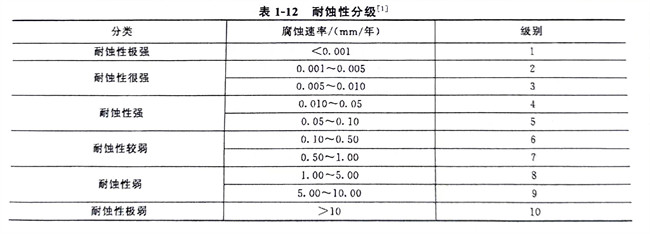 評定均(jun)勻腐(fu)蝕(shi)的方法是在試驗條(tiao)件下,測出單位面積(ji)上(shang)經(jing)一定時間腐(fu)蝕(shi)以后(hou)所損失的質量[g/(㎡·年)],即腐(fu)蝕(shi)速(su)率,若以被(bei)腐(fu)蝕(shi)的深度(du)(mm/年)計,則更便于計算設備的耐(nai)蝕(shi)壽命。表1-12 為(wei)耐(nai)蝕(shi)性分級。