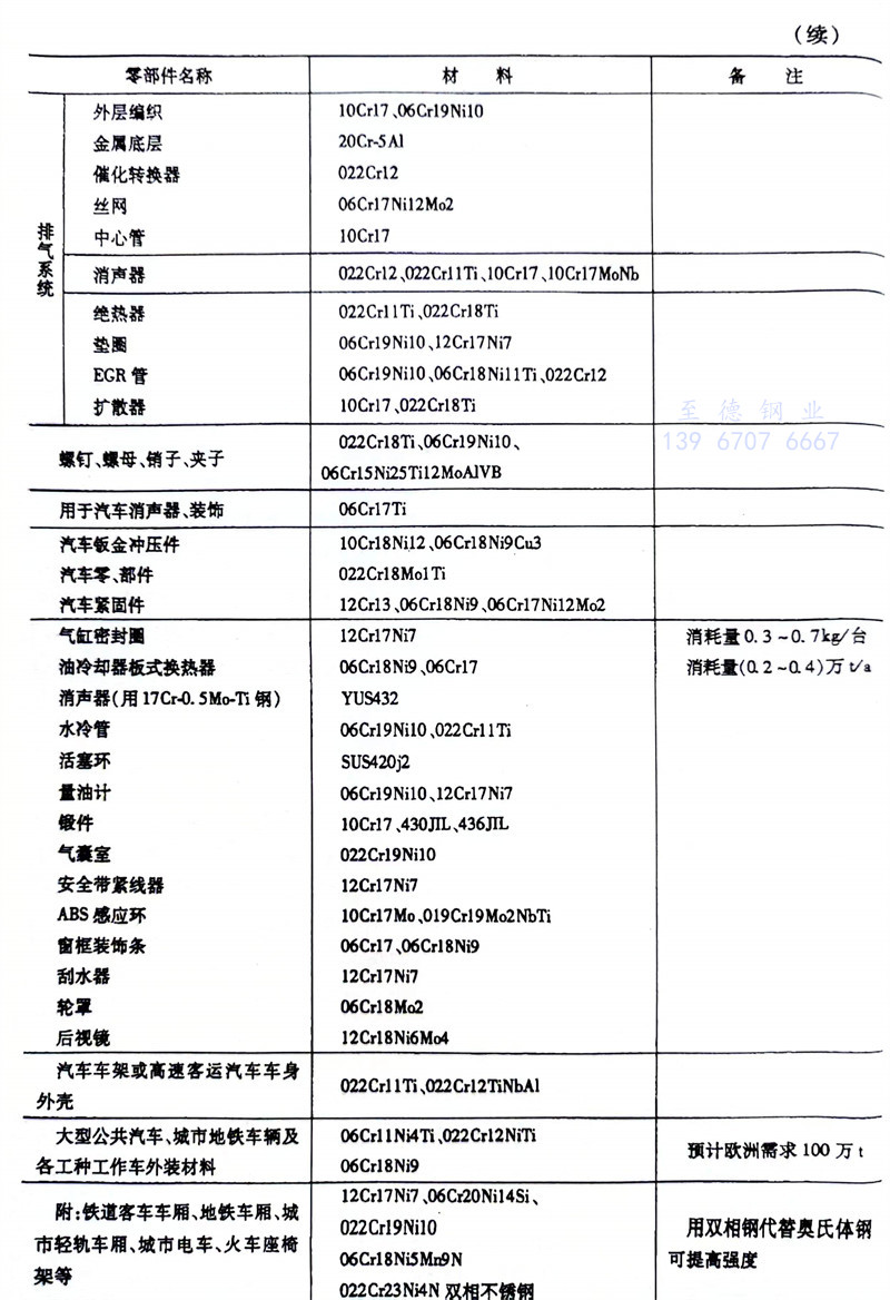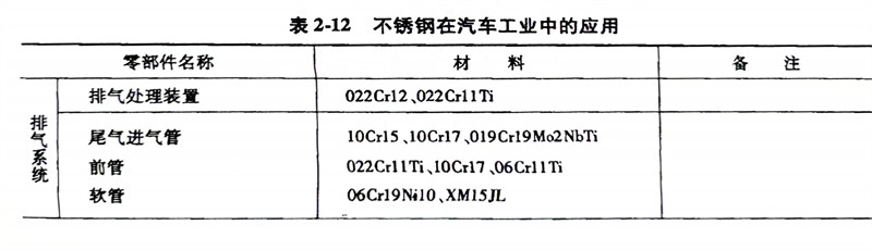 當前汽車工業的技術發展面臨著四大挑戰,即減少污染、節約能源、降低成本和安全措施。在汽車尾氣排放中采用強制性控制措施,不(bu)銹鋼在排氣系統上得到應用。國際上現代轎車發動機的排氣系統都采用不銹鋼制造,其中80%為鐵素(su)體不銹鋼(022Cr12、022Cr11Ti、10Cr15、10Cr17、019Cr19Mo2NbTi等)制造,每輛車大約使用不銹鋼23~25kg;按每年生產200萬輛車計算,鐵素體不銹鋼年消耗量為5萬噸。汽車上其他零件,如消聲器、緊固件、沖壓件以及一些零部件都需要用不銹鋼制造。其應用情況見表2-12。