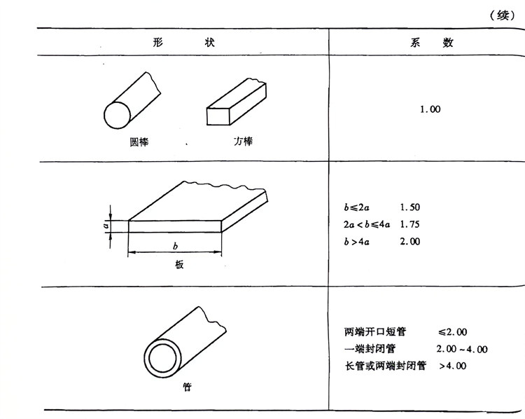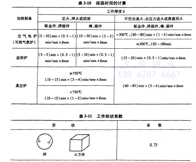 根據工件(jian)(jian)的(de)(de)材料以及對(dui)表面質量的(de)(de)要(yao)求,應正確選用加(jia)熱(re)(re)(re)設備、加(jia)熱(re)(re)(re)介質和(he)加(jia)熱(re)(re)(re)方法。對(dui)有(you)(you)回槽和(he)不通孔的(de)(de)工件(jian)(jian)、鑄件(jian)(jian)和(he)焊接(jie)件(jian)(jian)以及加(jia)工成形的(de)(de)不銹鋼工件(jian)(jian),一般(ban)不宜在(zai)鹽浴中加(jia)熱(re)(re)(re)。工件(jian)(jian)加(jia)熱(re)(re)(re)應有(you)(you)足夠的(de)(de)保溫(wen)時間。可(ke)根據工件(jian)(jian)的(de)(de)有(you)(you)效厚(hou)度和(he)條件(jian)(jian)厚(hou)度(實際厚(hou)度乘以工件(jian)(jian)形狀系數(shu)),參照表3-10和(he)表3-11進(jin)行計算。
