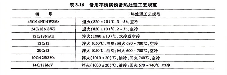 不銹鋼(gang)零件(jian)在滲(shen)氮前一般(ban)應進(jin)行退火(huo)處(chu)理(li)(li)和調質處(chu)理(li)(li),其(qi)目的是為(wei)了消除加工應力、改(gai)善組(zu)織(zhi)。常用不銹鋼(gang)預備熱處(chu)理(li)(li)工藝規范見表3-16。