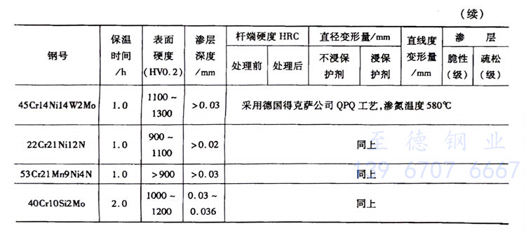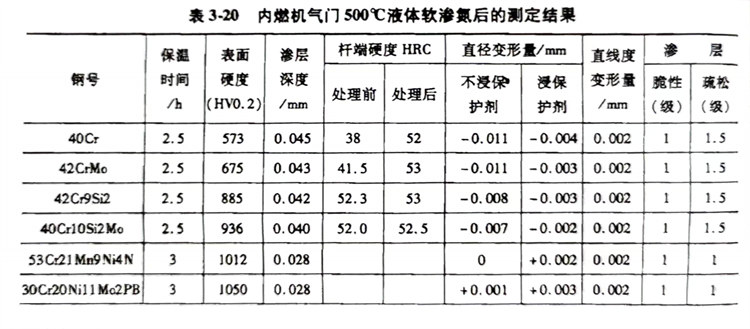 該工(gong)(gong)藝與(yu)QPQ工(gong)(gong)藝、商業(ye)鹽(yan)J-2、TF-1工(gong)(gong)藝相同。氣(qi)門(men)經低(di)溫無毒鹽(yan)浴共滲(500℃×3h)和氧化(hua)復(fu)合處(chu)理(在(zai)160℃的(de)氧化(hua)劑中保溫20min)后,其耐蝕性和外觀(guan)質(zhi)量優異,硬度均在(zai)50HRC以上,變(bian)形小。內燃機氣(qi)門(men)500℃液(ye)體軟滲氮后的(de)測定結果見(jian)表3-20。