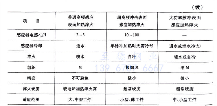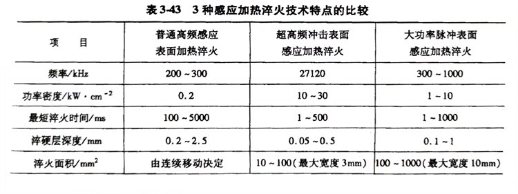 高頻(pin)感(gan)應加(jia)(jia)熱(re)向著超高沖擊(ji)淬(cui)(cui)(cui)火(huo)和大功率(lv)脈沖感(gan)應加(jia)(jia)熱(re)淬(cui)(cui)(cui)火(huo)的(de)方(fang)向發展。表3-43是普(pu)通高頻(pin)感(gan)應表面加(jia)(jia)熱(re)淬(cui)(cui)(cui)火(huo)、超高頻(pin)沖擊(ji)表面感(gan)應加(jia)(jia)熱(re)淬(cui)(cui)(cui)火(huo)、大功率(lv)脈沖表面感(gan)應加(jia)(jia)熱(re)淬(cui)(cui)(cui)火(huo)的(de)技術(shu)特(te)點比(bi)較(jiao)。