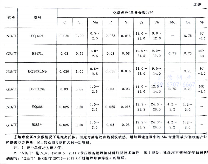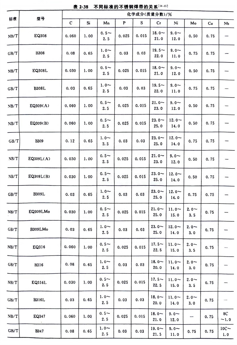 NB/T 47018.5-2011標(biao)準(zhun)(zhun)對S、P含量的(de)(de)限制嚴于GB/T 29713-2013標(biao)準(zhun)(zhun)。NB/T 47018.5-2011標(biao)準(zhun)(zhun)焊帶(dai)(dai)Mo含量上限普遍低于GB/T 29713-2013標(biao)準(zhun)(zhun)要求(qiu)。NB/T 47018.5-2011標(biao)準(zhun)(zhun)規定的(de)(de)焊帶(dai)(dai)與GB/T 29713-2013標(biao)準(zhun)(zhun)規定的(de)(de)焊帶(dai)(dai)之(zhi)間的(de)(de)關系見表(biao)2-38。通過表(biao)2-38的(de)(de)數據可得(de)知兩(liang)標(biao)準(zhun)(zhun)的(de)(de)焊帶(dai)(dai)化學成(cheng)分(fen)比較接近(鄰近的(de)(de)焊帶(dai)(dai)牌號),但沒有(you)完全符(fu)合的(de)(de)焊帶(dai)(dai)。