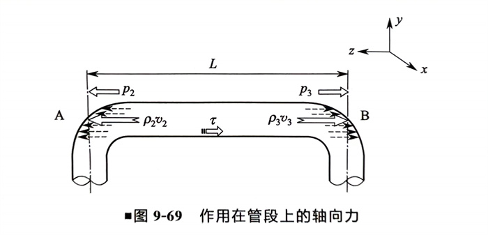 在(zai)計算中(zhong),假設介質是在(zai)固(gu)定住的管道中(zhong)流動(v1),不考慮管道本(ben)身振(zhen)動的影響,作用在(zai)管道上的流體載荷(he)計算見圖9-69所示: