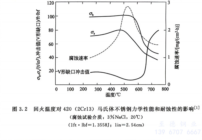 馬氏體鉻不銹鋼主要指1Cr13、2Cr13、3Cr13、4Cr13等傳統馬(ma)氏體不銹鋼(gang),它們的鉻含量≥11.5%,最高18%,使此類鋼具有不銹性和在弱介質中的鋼,它們的含鉻耐蝕性;鋼中含碳量隨鋼中含鉻量的不同,一般在0.10%~1.0%范圍內,以保證高溫下為奧氏體,淬火后室溫下為馬氏體,通過層片狀高碳馬氏體的形成和碳化物的析出,使此類鋼具有高強度和高硬度,淬火后再經回火,消除淬火應力并獲得均勻穩定的組織,使此類鋼具有一定的塑、韌性和良好的耐蝕性等綜合性能,見圖3.2。由于馬氏體鉻不銹鋼的不銹耐蝕性在所有不銹鋼類中處于劣勢(見表3.1),而且塑、韌性差,焊接性不良或根本不能焊接,從而限制了它們的廣泛應用。根據世界范圍內的統計,此類鋼的產量占不銹鋼總產量的1%左右。