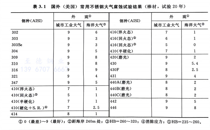 國外常用不銹鋼大氣腐蝕試(shi)驗結果(棒材(cai),試(shi)驗 20年)