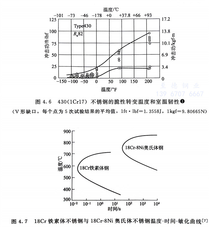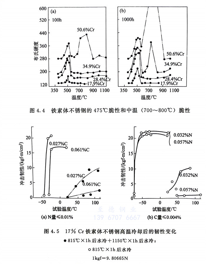 ①. 有三個脆(cui)性區,即475℃脆(cui)性、中溫脆(cui)性和(he)高(gao)溫脆(cui)性,見圖4.4和(he)圖4.5,此時鐵素體不銹鋼的硬度(du)顯(xian)著增加,塑、韌性急劇下降。