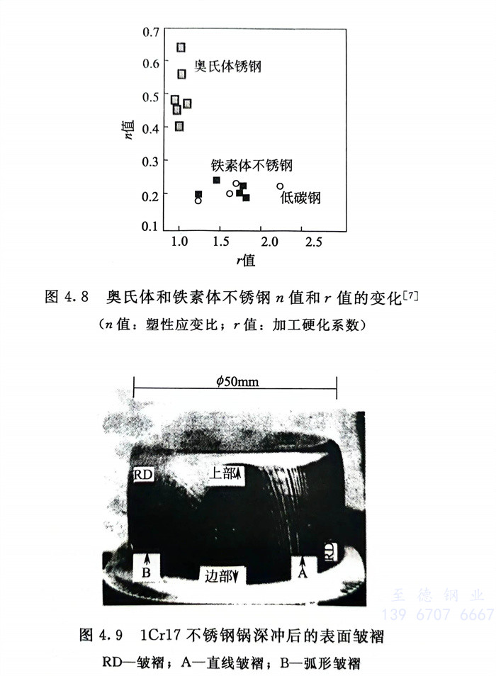 ④. 冷(leng)成(cheng)(cheng)型性需(xu)進(jin)一步改善。雖然(ran)低、中鉻傳統鐵素體(ti)(ti)不(bu)銹(xiu)(xiu)鋼已(yi)具有(you)良(liang)好(hao)的(de)冷(leng)成(cheng)(cheng)型性,包(bao)括優良(liang)的(de)深(shen)沖(chong)性,但(dan)是,與18-8鉻鎳奧氏體(ti)(ti)不(bu)銹(xiu)(xiu)鋼相(xiang)比(bi)還有(you)一些差距,n值(zhi)較低,但(dan)與低碳鋼相(xiang)近,已(yi)無太大提高(gao)余地(di),而r值(zhi)與低碳鋼相(xiang)比(bi),尚(shang)有(you)很大潛力,有(you)待進(jin)一步提高(gao)(圖4.8),同時,深(shen)沖(chong)件表面易出現(xian)皺褶(zhe),鋼的(de)抗皺性尚(shang)需(xu)進(jin)一步改善,圖4.9系1Cr17(430)不(bu)銹(xiu)(xiu)鋼鍋深(shen)沖(chong)后(hou)的(de)表面皺褶(zhe)。由(you)于鐵素體(ti)(ti)不(bu)銹(xiu)(xiu)鋼冷(leng)加工硬(ying)化傾向小,伸長率低,Er(埃里(li)克森杯突(tu)值(zhi))值(zhi)小,一般(ban)不(bu)適于單純脹(zhang)形成(cheng)(cheng)型,但(dan)能(neng)用于深(shen)沖(chong)與脹(zhang)形(鼓凸)復合型冷(leng)成(cheng)(cheng)型。