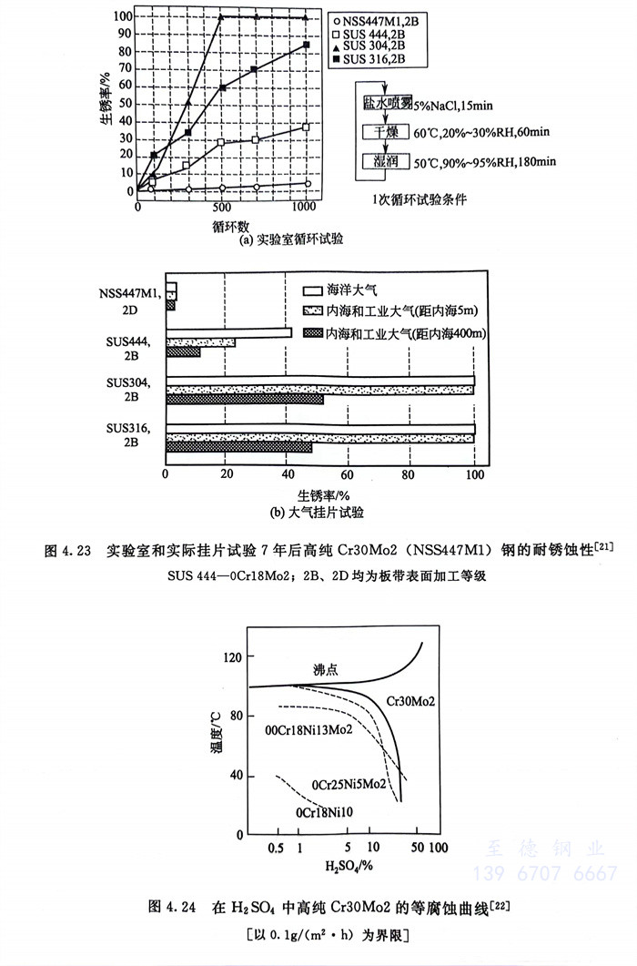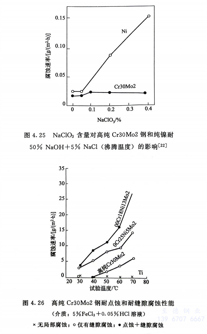 在各種大(da)氣和各種酸、堿、鹽介質中,高純(chun)Cr30Mo2耐(nai)全面腐蝕(shi)和耐(nai)局部腐蝕(shi)性能均(jun)遠遠優于316型不銹(xiu)鋼,在含(han)氧化劑(ji)的NaOH中優于純(chun)鎳,一些(xie)試驗結果見圖4.23~圖4.27和表(biao)4.14。