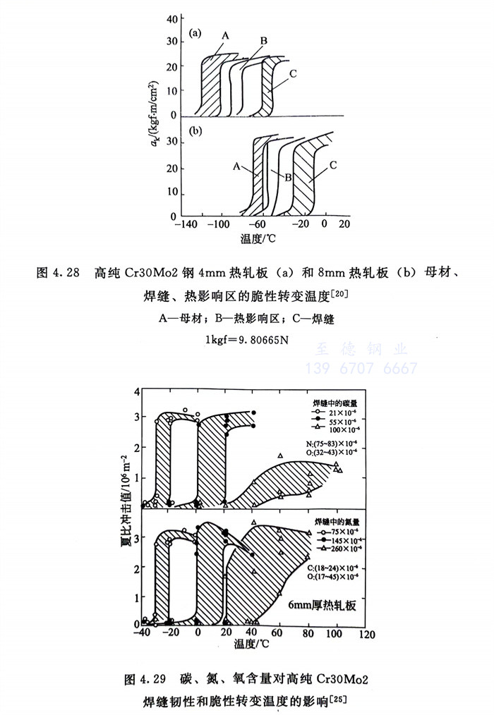 表4.15列(lie)出了高(gao)(gao)純(chun)Cr30Mo2 1.5mm板材冷成(cheng)型性數據。試驗(yan)還表明(ming),高(gao)(gao)純(chun)Cr30Mo2焊接性良好,焊后無晶(jing)間腐蝕(shi)傾向(xiang),在(zai)一些(xie)腐蝕(shi)介質中(zhong),焊前(qian)、焊后的(de)(de)耐蝕(shi)性無明(ming)顯差別(表4.16);適宜(yi)截面(mian)尺寸的(de)(de)高(gao)(gao)純(chun)Cr30Mo2鋼焊后的(de)(de)韌性和(he)脆(cui)性轉變溫度完全(quan)可滿足使(shi)用(yong)的(de)(de)需求(qiu)(見(jian)圖(tu)4.28);但(dan)是(shi),在(zai)焊接過程中(zhong),要采取措施防止碳、氮(dan)等(deng)間隙元(yuan)素對(dui)焊縫的(de)(de)污染(ran)。圖(tu)4.29系(xi)因焊縫污染(ran)而引(yin)起的(de)(de)高(gao)(gao)純(chun)Cr30Mo2鋼焊后韌性的(de)(de)降低和(he)脆(cui)性轉變溫度的(de)(de)升高(gao)(gao)。