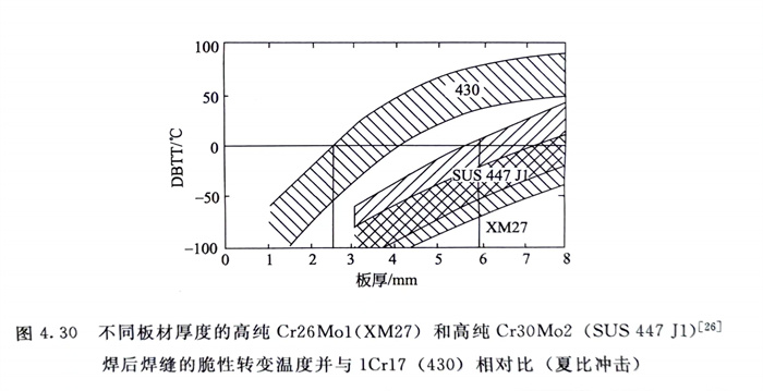 圖4.30指出了1Cr17(430)和兩種高純鐵素體不(bu)銹鋼(gang)高純Cr26Mol(XM27)和高純Cr30Mo2不同厚度板材焊后焊縫的脆性轉變溫度,可以明顯看出,高純化對鐵素體不銹鋼的韌性的改善是非常顯著的,如果以攝氏零度為使用界限的話,1Cr17焊材僅能用于厚度≤2.5mm,而高純、高鉻的Cr26Mo1和Cr30Mo2則可用到6mm,若為3mm薄板,則可用到-50℃以下。