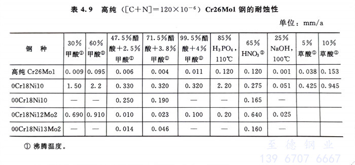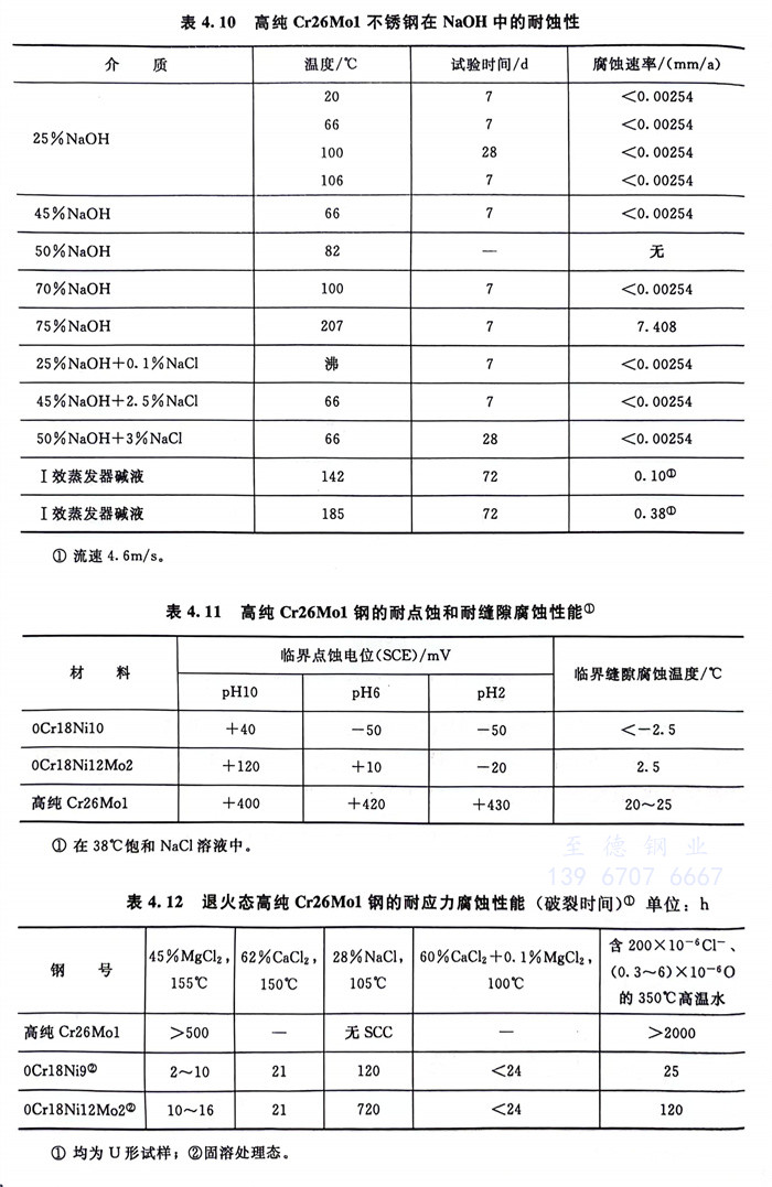 高純Cr26Mo1耐(nai)(nai)蝕性優良,即使在65%沸騰HNO3和(he)NaOH中(zhong)亦然(見(jian)表4.9和(he)表4.10);在耐(nai)(nai)點蝕、耐(nai)(nai)縫隙腐(fu)蝕、耐(nai)(nai)應(ying)力腐(fu)蝕等局部腐(fu)蝕中(zhong)均既優于0Cr18Ni10,也(ye)優于0Cr18Ni12Mo2。一些結(jie)果見(jian)表4.11和(he)表4.12。