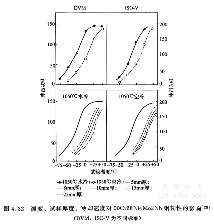 一些試驗結果見表4.17、圖4.31及圖4.32。可以看出:兩種超(chao)級鐵素體不銹鋼的韌性和脆性轉變溫度均受鋼的截面和冷卻速度的影響,在適宜的截面尺寸下,兩種鋼均具有足夠的室溫韌性和較低的脆性轉變溫度。