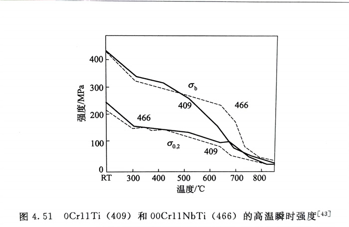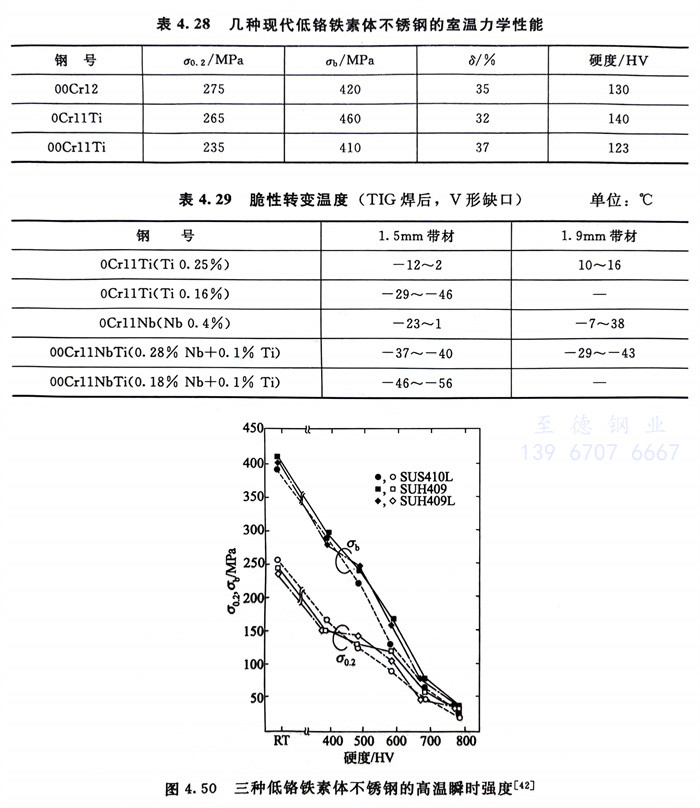 幾種現代(dai)低鉻(ge)鐵素體不銹鋼的室溫(wen)、高溫(wen)力學性(xing)能(neng)和脆(cui)性(xing)轉(zhuan)變溫(wen)度(du)見表4.28和表4.29,以及圖4.50和圖4.51。從表4.29的結果可看出(chu),用Ti、Nb雙穩(wen)定化的00Cr11NbTi(466)有最低的脆(cui)性(xing)轉(zhuan)變溫(wen)度(du)。