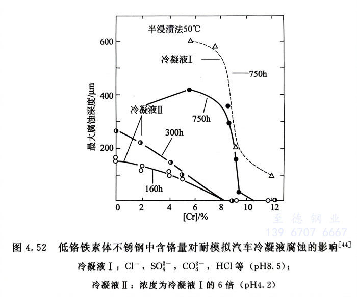 圖4.52 低鉻鐵素體(ti)不銹鋼中含鉻量對耐模擬(ni)汽車冷凝液腐蝕的影響