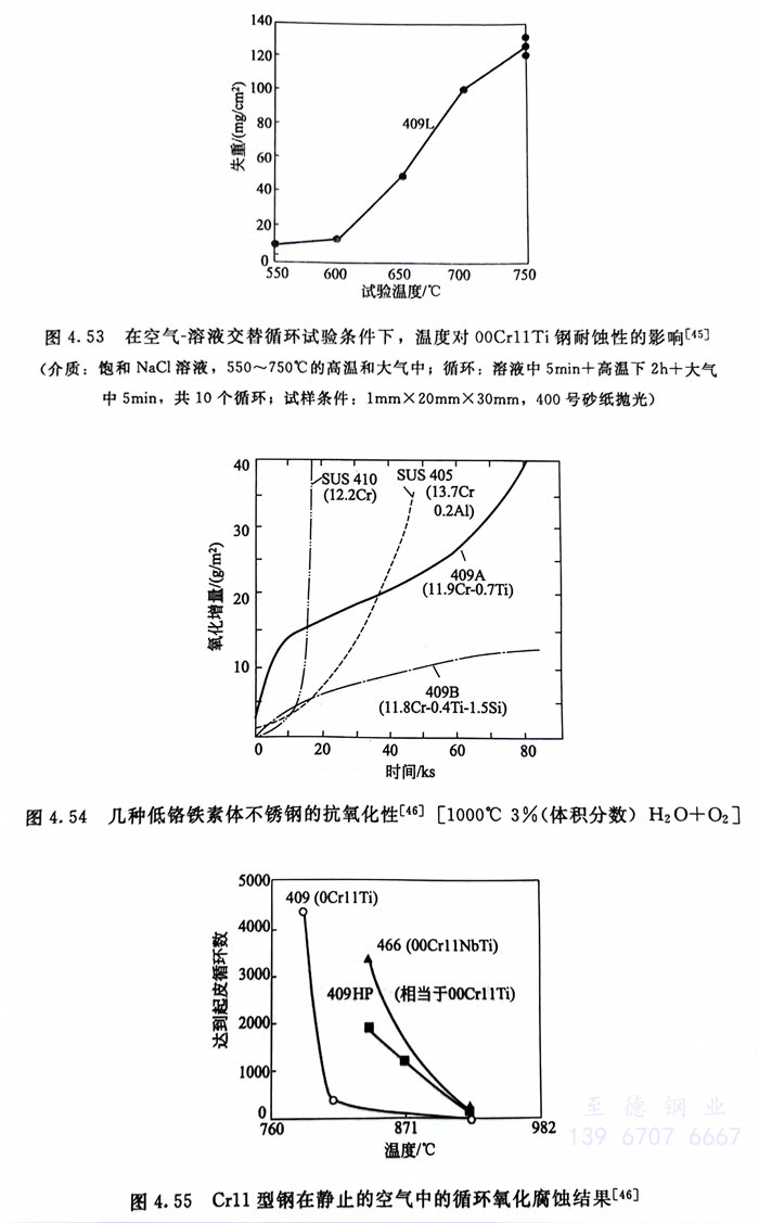 由于現代低鉻鐵素(su)體不銹(xiu)鋼大(da)量用(yong)作汽(qi)(qi)車(che)排(pai)氣系統構件(jian),因而在模擬汽(qi)(qi)車(che)冷凝中(zhong)(zhong)進行了(le)大(da)量試驗(yan)。圖(tu)(tu)4.52和(he)圖(tu)(tu)4.53系一些試驗(yan)結果。模擬汽(qi)(qi)車(che)的使(shi)用(yong)條(tiao)(tiao)件(jian),還在大(da)氣中(zhong)(zhong)進行了(le)抗氧(yang)化試驗(yan)和(he)空氣與溶液循環交替條(tiao)(tiao)件(jian)下(xia)的試驗(yan),結果見圖(tu)(tu)4.54和(he)圖(tu)(tu)4.55。為(wei)了(le)防止晶間腐(fu)蝕(shi),在汽(qi)(qi)車(che)構件(jian)中(zhong)(zhong)使(shi)用(yong)的所有現代低鉻鐵素(su)體不銹(xiu)鋼均含有穩定化元(yuan)素(su)。