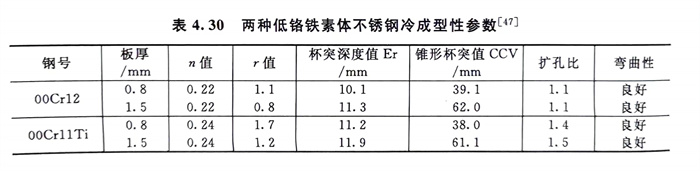 現代低鉻鐵素(su)體不(bu)銹(xiu)鋼由于(yu)鉻量低且低碳、超低碳,加之很多牌號又含鈦、鈮,因而(er)冷成(cheng)型(xing)性和焊接性均(jun)優(you)良。表4.30列出了兩種現代鐵素(su)體不(bu)銹(xiu)鋼的冷成(cheng)型(xing)性參數。