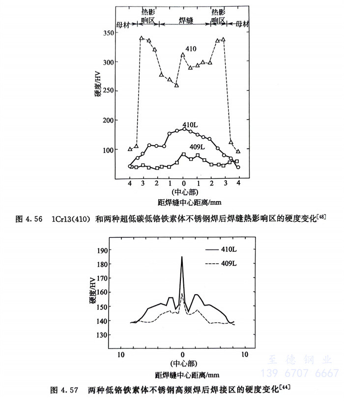現代低鉻(ge)(ge)鐵素體(ti)不銹(xiu)鋼(gang)的(de)(de)焊(han)接性在(zai)鐵素體(ti)不銹(xiu)鋼(gang)中最佳,焊(han)后沒(mei)有(you)熱裂傾向和(he)晶間腐蝕(shi)的(de)(de)敏感性,超低碳(tan)低鉻(ge)(ge)鐵素體(ti)不銹(xiu)鋼(gang)焊(han)后熱影響(xiang)區硬度無(wu)明顯變化〔見(jian)圖4.56和(he)圖4.57),焊(han)后韌性可(ke)滿足(zu)使用(yong)需求(qiu)。表4.31列出了(le)高頻(pin)焊(han)管的(de)(de)力學性能和(he)壓扁、擴口的(de)(de)結(jie)果。