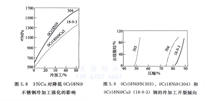 1Cr18Ni12和(he)0Cr18Ni9Cu3,前者是(shi)通過提高1Cr18Ni9鋼的鎳含量,使(shi)(shi)奧氏(shi)體更(geng)加(jia)(jia)穩定,經(jing)較(jiao)大(da)冷變(bian)(bian)形(xing)(xing)后(hou),可(ke)基本上不產生馬(ma)氏(shi)體相(xiang)變(bian)(bian),既可(ke)使(shi)(shi)鋼的冷加(jia)(jia)工(gong)硬化(hua)傾向小(xiao)(xiao),更(geng)易于(yu)冷加(jia)(jia)工(gong)成型,減少中間退火次數。同時,由(you)于(yu)固溶態與軋態的透磁率(lv)變(bian)(bian)化(hua)很小(xiao)(xiao)(表5.3),較(jiao)0Cr18Ni9(304)更(geng)適于(yu)無磁用(yong)途(tu)。而(er)0Cr18Ni9Cu3則系(xi)加(jia)(jia)入銅使(shi)(shi)奧氏(shi)體更(geng)加(jia)(jia)穩定,冷加(jia)(jia)工(gong)過程轉變(bian)(bian)為(wei)馬(ma)氏(shi)體的敏感性降(jiang)低,從而(er)使(shi)(shi)鋼的冷作硬化(hua)傾向和(he)冷作速率(lv)以及冷開裂敏感性下降(jiang),使(shi)(shi)此鋼在(zai)較(jiao)小(xiao)(xiao)變(bian)(bian)形(xing)(xing)力作用(yong)下可(ke)獲得最(zui)大(da)的冷變(bian)(bian)形(xing)(xing),因此,0Cr18Ni9Cu3更(geng)適于(yu)緊固件和(he)深(shen)(shen)沖、深(shen)(shen)拉(la)等用(yong)途(tu)。圖(tu)(tu)5.8和(he)圖(tu)(tu)5.9系(xi)一些試驗結果。