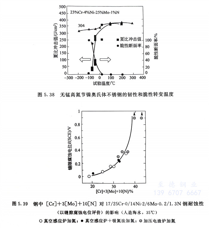 國(guo)外用(yong)加壓電(dian)渣爐冶煉了高(gao)氮(0.5%~1.5%N)無錳節(jie)鎳的(de)Cr-Mo-Ni-N 和無錳無鎳的(de)Cr-Mo-N不銹鋼并研(yan)究了它們的(de)性能(見圖(tu)5.37~圖(tu)5.39)。