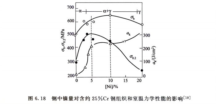 圖6.18系浙江至德鋼業有限公司試驗取得的結果。在含25%Cr雙相不銹鋼(gang)管的情況下,加入不同鎳量,調整不同的鉻當量/鎳當量以獲得不同的相比例并測定了它們的力學性能。可以看出,隨鋼中鎳量的增加,此鋼從單相鐵素體向α+γ雙相組織過渡,當含鎳量約達18%時,又基本上系單相奧氏體。在雙相區內,當含鎳量在約5%時,鋼的屈服強度達到最高值,此時的a/γ比例并不到1:1,鎳量再增加,y量加大,則屈服強度明顯下降;當含鎳量約達10%,此時γ量已超過50%,鋼的抗拉強度達到最高值,隨后稍有下降;而鋼的沖擊韌性值則隨鎳量增加、γ相量的增多而提高,達單一奧氏體組織時,此鋼具有最高的沖擊韌性值。