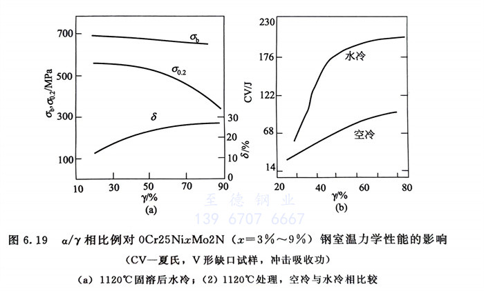 圖(tu)6.19系含3%~9%Ni的0Cr25NixMo2N雙相(xiang)不(bu)銹鋼(gang)管,經不(bu)同固溶處理后(hou)的相(xiang)比例(li)對鋼(gang)的力學性(xing)能的影響。可以(yi)看出,隨γ奧氏體量增加,屈服強度明顯(xian)(xian)下降,而伸長率和沖擊(ji)(ji)功(gong)則(ze)明顯(xian)(xian)上升,此結果與圖(tu)6.18的結果基本一(yi)致。圖(tu)中冷卻速度(水冷、空冷)不(bu)同,鋼(gang)的沖擊(ji)(ji)功(gong)差別(bie)較大(da),這顯(xian)(xian)示了鋼(gang)中鐵素體的存在,碳、氮化物析出的影響。