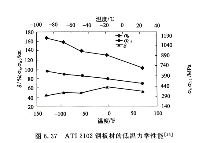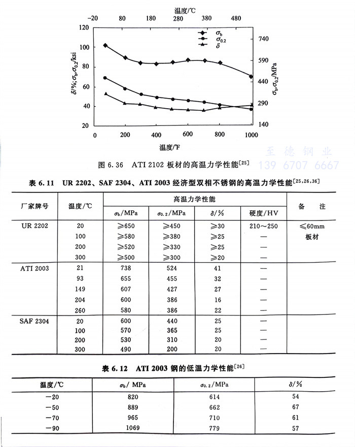 幾種經濟型雙相不銹鋼的高溫力學性能見圖6.36和表6.11,低溫力學性能見圖6.37和表6.12。