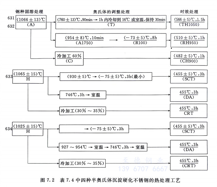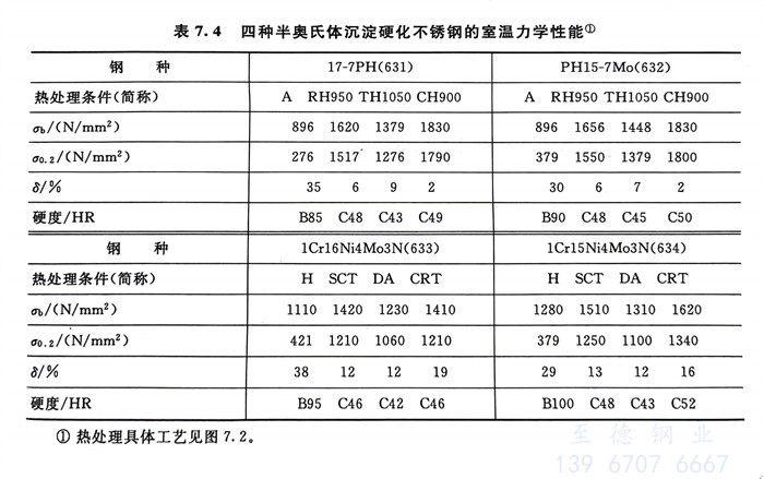 表7.4列入了四種半奧氏體沉淀硬化(hua)不銹(xiu)鋼不同熱處理狀態的力學性能熱處理的具體工藝見圖7.2。
