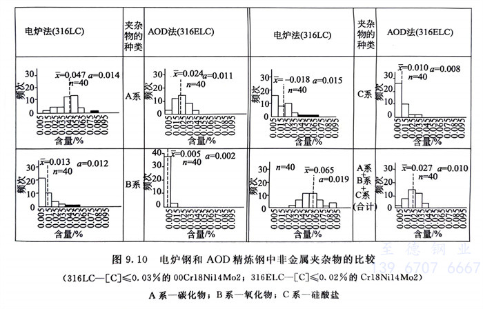 圖(tu)9.10系電爐(lu)法與AOD精(jing)煉鋼中非金屬(shu)夾雜物(wu)含量的比較。顯然AOD精(jing)煉鋼中的非金屬(shu)夾雜物(wu)遠低于(yu)電爐(lu)鋼。