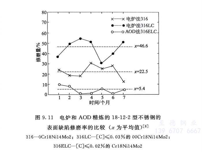 圖9.11系電爐鋼(gang)和AOD二次(ci)精煉(lian)鋼(gang)修磨率的對比(bi),顯(xian)然(ran)AOD精煉(lian)鋼(gang)修磨率低于(yu)電爐鋼(gang)。