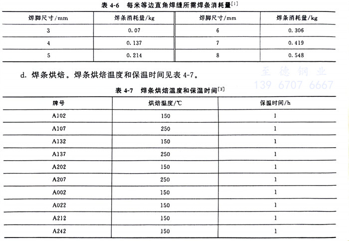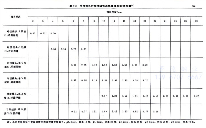 對(dui)接接頭對(dui)接焊(han)縫每(mei)米焊(han)縫所(suo)(suo)消耗焊(han)條(tiao)的(de)(de)重量,參(can)見表(biao)4-5,等邊直角焊(han)縫每(mei)米所(suo)(suo)消耗焊(han)條(tiao)的(de)(de)重量參(can)見表(biao)4-6。為了準確地計(ji)算(suan)焊(han)條(tiao)的(de)(de)消耗量,推薦下列計(ji)算(suan)公式。