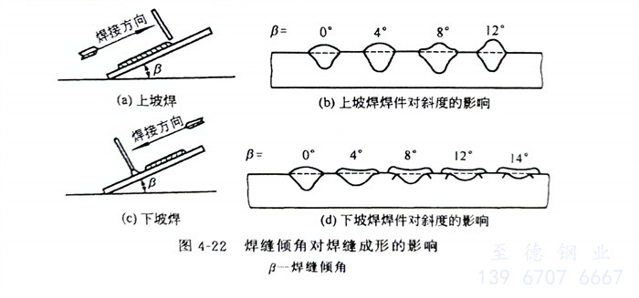 焊(han)(han)(han)(han)件(jian)在(zai)傾斜位置焊(han)(han)(han)(han)接時,有(you)上(shang)坡(po)(po)(po)(po)(po)焊(han)(han)(han)(han)和(he)下(xia)坡(po)(po)(po)(po)(po)焊(han)(han)(han)(han)之分,如(ru)圖4-22所(suo)示。上(shang)坡(po)(po)(po)(po)(po)焊(han)(han)(han)(han)、下(xia)坡(po)(po)(po)(po)(po)焊(han)(han)(han)(han)對焊(han)(han)(han)(han)縫(feng)成形(xing)(xing)的影響明(ming)顯地不(bu)同。上(shang)坡(po)(po)(po)(po)(po)焊(han)(han)(han)(han)時,焊(han)(han)(han)(han)縫(feng)余高(gao)過高(gao),兩側易出現咬邊,焊(han)(han)(han)(han)縫(feng)表面成形(xing)(xing)明(ming)顯惡化,實際工作(zuo)中應避免采用(yong)上(shang)坡(po)(po)(po)(po)(po)焊(han)(han)(han)(han)。下(xia)坡(po)(po)(po)(po)(po)焊(han)(han)(han)(han)與上(shang)坡(po)(po)(po)(po)(po)焊(han)(han)(han)(han)相反,焊(han)(han)(han)(han)縫(feng)的熔(rong)深和(he)余高(gao)均有(you)所(suo)減小(xiao),而焊(han)(han)(han)(han)縫(feng)寬度(du)略有(you)增加,焊(han)(han)(han)(han)縫(feng)成形(xing)(xing)得到改善。在(zai)焊(han)(han)(han)(han)接圓筒焊(han)(han)(han)(han)件(jian)的內、外環焊(han)(han)(han)(han)縫(feng)時,一般(ban)均采用(yong)下(xia)坡(po)(po)(po)(po)(po)焊(han)(han)(han)(han),以減少發生(sheng)燒穿的現象,并改善焊(han)(han)(han)(han)縫(feng)成形(xing)(xing)。但焊(han)(han)(han)(han)件(jian)下(xia)坡(po)(po)(po)(po)(po)焊(han)(han)(han)(han)的角(jiao)度(du)過大時,熔(rong)深減小(xiao)可能產生(sheng)未焊(han)(han)(han)(han)透焊(han)(han)(han)(han)接缺陷。