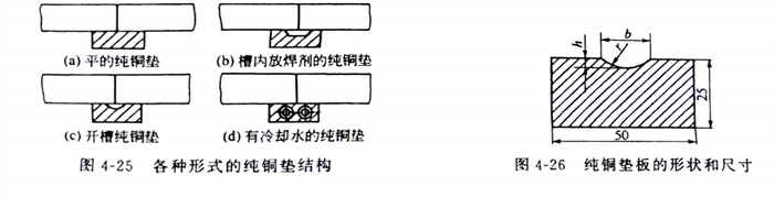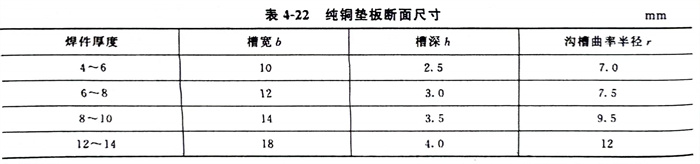 這種(zhong)焊(han)(han)(han)接(jie)方(fang)法(fa)能使(shi)焊(han)(han)(han)接(jie)構(gou)件(jian)達到單面(mian)焊(han)(han)(han)背(bei)面(mian)成形(xing)的(de)(de)(de)目的(de)(de)(de)。純銅墊靠焊(han)(han)(han)接(jie)夾具(ju)緊貼待焊(han)(han)(han)接(jie)頭下面(mian),它與(yu)焊(han)(han)(han)件(jian)之間(jian)的(de)(de)(de)間(jian)隙不允許大于0.5mm,各種(zhong)形(xing)式(shi)的(de)(de)(de)純銅墊結(jie)構(gou)如(ru)圖4-25所示,純銅墊板的(de)(de)(de)形(xing)狀(zhuang)和(he)尺寸(cun)見圖4-26和(he)表4-22。在純銅墊接(jie)觸焊(han)(han)(han)件(jian)的(de)(de)(de)一(yi)面(mian)開槽(cao),槽(cao)的(de)(de)(de)中心要與(yu)坡口根間(jian)隙對準,如(ru)果(guo)在槽(cao)內放焊(han)(han)(han)劑[見圖4-25(b)],則(ze)檀(tan)的(de)(de)(de)寬度和(he)深度都要相(xiang)應地加(jia)寬加(jia)深。