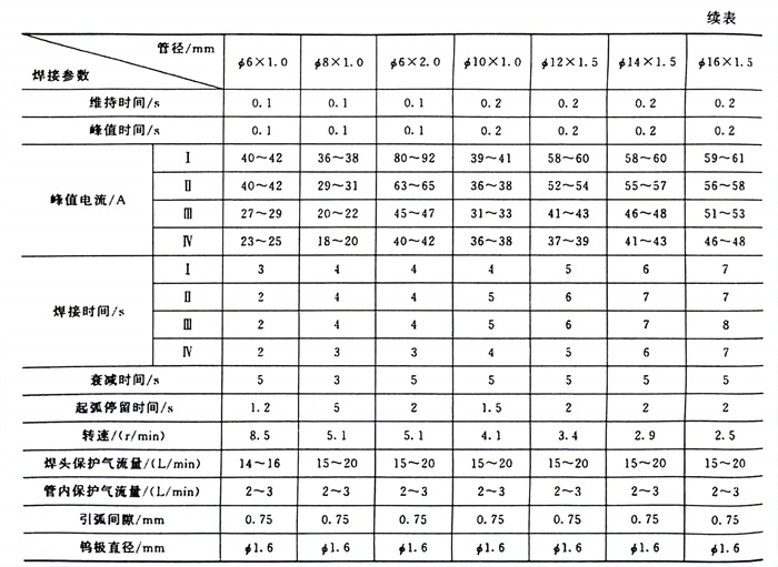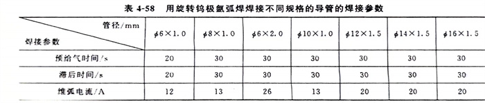 焊(han)接參(can)數對(dui)焊(han)接質量(liang)的(de)影響(xiang)頗大,其中峰值(zhi)電流(liu)在每個(ge)焊(han)接區(qu)域(導管固定不動(dong),焊(han)接分上、下、左(zuo)、右4個(ge)區(qu))的(de)變化(hua)值(zhi)、引弧間隙(xi)、氣體(ti)流(liu)量(liang)、鎢極(ji)直徑等參(can)數變化(hua)的(de)影響(xiang)較為突(tu)出。經過一系(xi)列的(de)焊(han)接工藝(yi)試驗得出如(ru)表4-58所(suo)示的(de)數值(zhi)。