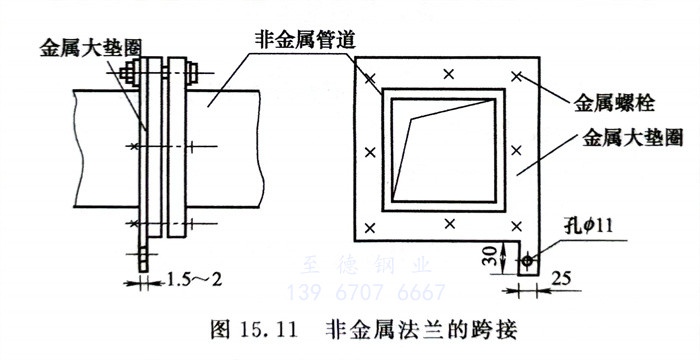 ④. 塑料等(deng)非金(jin)(jin)屬(shu)法蘭用金(jin)(jin)屬(shu)螺(luo)栓(shuan)緊固連(lian)接,可加金(jin)(jin)屬(shu)大墊(dian)圈,使所(suo)有螺(luo)栓(shuan)均相(xiang)接在一(yi)起(qi),然(ran)后再(zai)引出去接地。跨接示意圖(tu)見圖(tu)15.11。