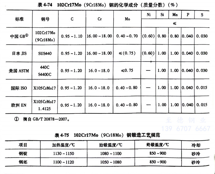102Cr17Mo (9Cr18Mo)1.4125、440C不銹鋼的化學成分見表4-74。