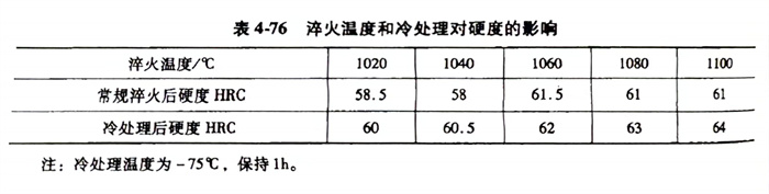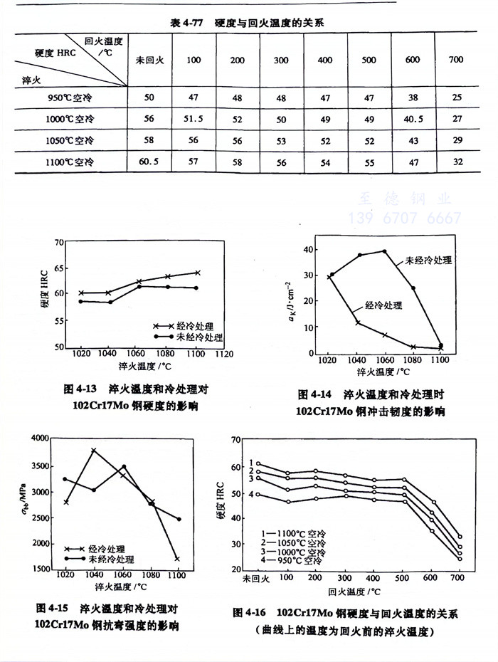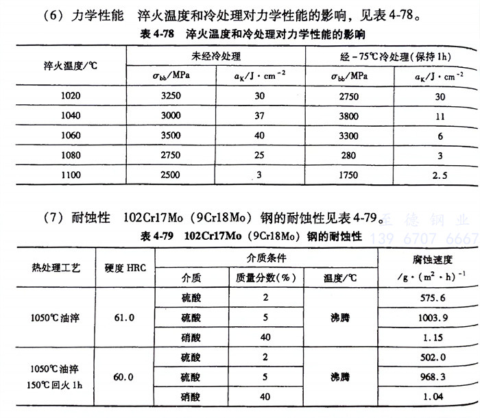 102Cr17Mo (9Cr18Mo)1.4125、440C不銹鋼淬火(huo)溫(wen)度和(he)冷處理對力學(xue)性能的影響,見表(biao)4-78。