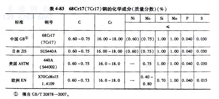 68Cr17(7Cr17)、1.4109、S44002、440A不銹鋼的化學成分見表4-83。