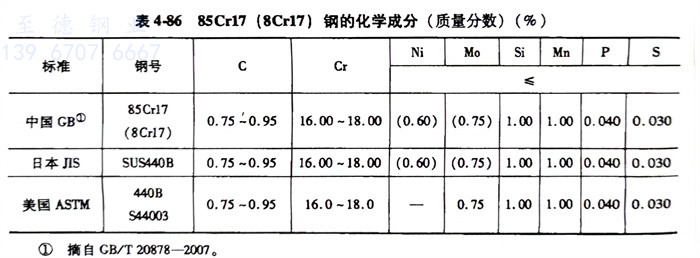 85Cr17(8Cr17)、S44003、SUS440B不銹(xiu)鋼(gang)的(de)化學(xue)成(cheng)分(fen)見表4-86。