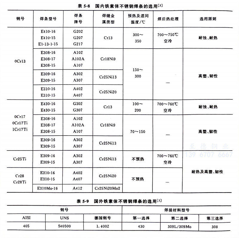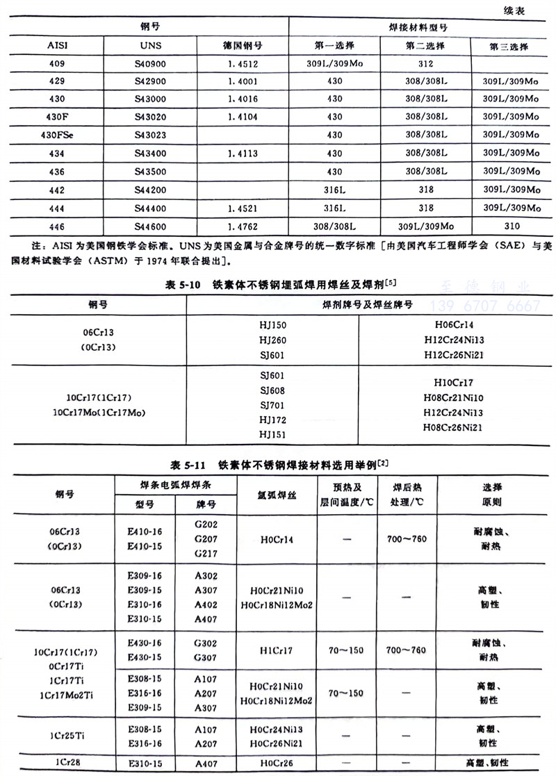 國(guo)(guo)內鐵(tie)素(su)(su)體(ti)不銹鋼(gang)(gang)(gang)焊(han)條的(de)選(xuan)用(yong)見(jian)表(biao)5-8,國(guo)(guo)外鐵(tie)素(su)(su)體(ti)不銹鋼(gang)(gang)(gang)焊(han)條的(de)選(xuan)用(yong)見(jian)表(biao)5-9。鐵(tie)素(su)(su)體(ti)不銹鋼(gang)(gang)(gang)埋弧(hu)焊(han)用(yong)焊(han)接材(cai)料(liao)見(jian)表(biao)5-10。鐵(tie)素(su)(su)體(ti)不銹鋼(gang)(gang)(gang)焊(han)接材(cai)料(liao)選(xuan)用(yong)舉例見(jian)表(biao)5-11。