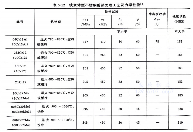 鐵素體型不(bu)銹鋼的熱(re)處理工(gong)藝及力學(xue)性(xing)能見表5-12。