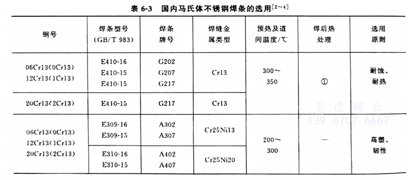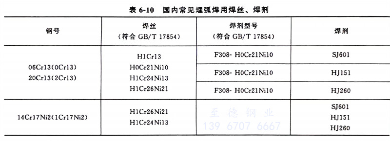 該焊(han)(han)(han)接(jie)(jie)方法(fa)焊(han)(han)(han)接(jie)(jie)質(zhi)量較(jiao)好,常用(yong)(yong)于(yu)薄板焊(han)(han)(han)接(jie)(jie)或多層焊(han)(han)(han)打底焊(han)(han)(han)。電極極性(xing)采用(yong)(yong)直流正接(jie)(jie)。由于(yu)裂(lie)紋傾向小,薄板焊(han)(han)(han)前可不(bu)預(yu)熱,厚板焊(han)(han)(han)前需預(yu)熱到120~200℃。一般選用(yong)(yong)與(yu)母(mu)材成(cheng)分和組織(zhi)相近(jin)的焊(han)(han)(han)絲(si),以保證與(yu)母(mu)材匹配。國(guo)內馬氏(shi)體(ti)型(xing)不(bu)銹(xiu)鋼焊(han)(han)(han)絲(si)選用(yong)(yong)見(jian)表(biao)(biao)6-6,國(guo)外常見(jian)馬氏(shi)體(ti)型(xing)不(bu)銹(xiu)鋼焊(han)(han)(han)絲(si)選用(yong)(yong)見(jian)表(biao)(biao)6-7。