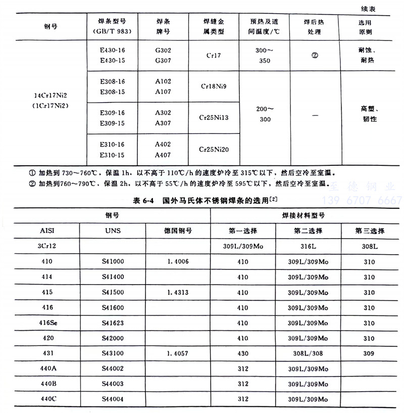 焊(han)(han)(han)(han)(han)接(jie)材料一般采(cai)用(yong)(yong)與母材同材質的(de)低氫型(xing)焊(han)(han)(han)(han)(han)條。如焊(han)(han)(han)(han)(han)后不能熱處(chu)理(li),則可(ke)(ke)選用(yong)(yong)抗裂性能好的(de)奧氏(shi)體(ti)鋼(gang)類型(xing)焊(han)(han)(han)(han)(han)條。此(ci)時相當(dang)于異種鋼(gang)焊(han)(han)(han)(han)(han)接(jie),可(ke)(ke)運(yun)用(yong)(yong)舍(she)夫勒(Schaeffler)組(zu)織圖、德(de)龍(Delong)組(zu)織圖,合(he)理(li)選擇焊(han)(han)(han)(han)(han)條,并(bing)嚴格控制母材對焊(han)(han)(han)(han)(han)縫的(de)稀釋。國(guo)內馬氏(shi)體(ti)不銹(xiu)鋼(gang)焊(han)(han)(han)(han)(han)接(jie)用(yong)(yong)焊(han)(han)(han)(han)(han)條見表6-3,國(guo)外馬氏(shi)體(ti)不銹(xiu)鋼(gang)焊(han)(han)(han)(han)(han)條的(de)選用(yong)(yong)見表6-4。