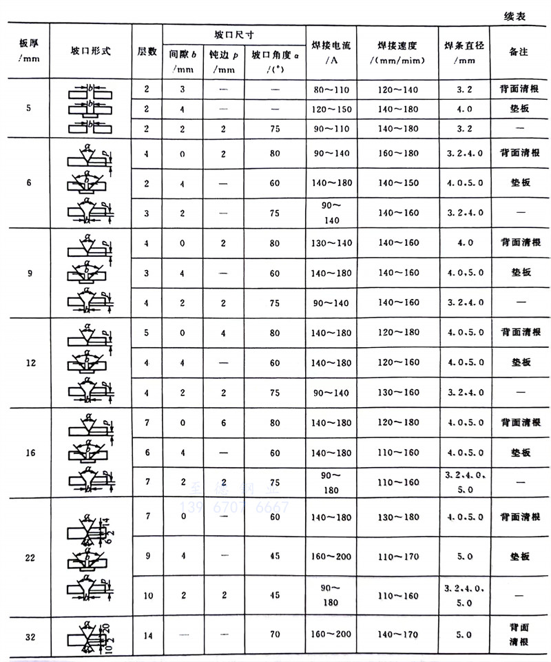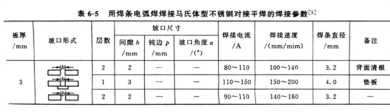 焊(han)(han)接(jie)時應選用較大的焊(han)(han)接(jie)電流,以增大熱輸(shu)入量,讓接(jie)頭緩慢冷卻。防止(zhi)焊(han)(han)后接(jie)頭產生(sheng)粗大硬脆(cui)的馬氏體和(he)應力集中而導致接(jie)頭產生(sheng)冷裂紋(wen)。焊(han)(han)條電弧焊(han)(han)焊(han)(han)接(jie)馬氏體型(xing)不銹鋼的焊(han)(han)接(jie)參(can)數見表6-5。