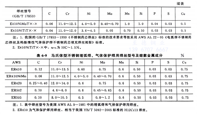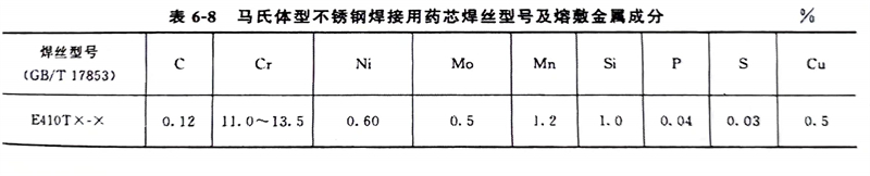 馬氏體(ti)型不(bu)銹鋼(gang)(gang)焊(han)(han)接用(yong)藥芯焊(han)(han)絲(si)型號(hao)及熔(rong)敷(fu)金(jin)屬(shu)(shu)(shu)成分見表6-8。馬氏體(ti)型不(bu)銹鋼(gang)(gang)埋弧焊(han)(han)、氣體(ti)保(bao)護焊(han)(han)用(yong)焊(han)(han)絲(si)型號(hao)及熔(rong)敷(fu)金(jin)屬(shu)(shu)(shu)成分見表6-9,其焊(han)(han)縫熔(rong)敷(fu)金(jin)屬(shu)(shu)(shu)成分與藥芯焊(han)(han)絲(si)熔(rong)敷(fu)金(jin)屬(shu)(shu)(shu)相比(bi)較,除了Si、Cu、Mn含量有(you)些(xie)區(qu)別外,其他合金(jin)元素含量基本一致。
