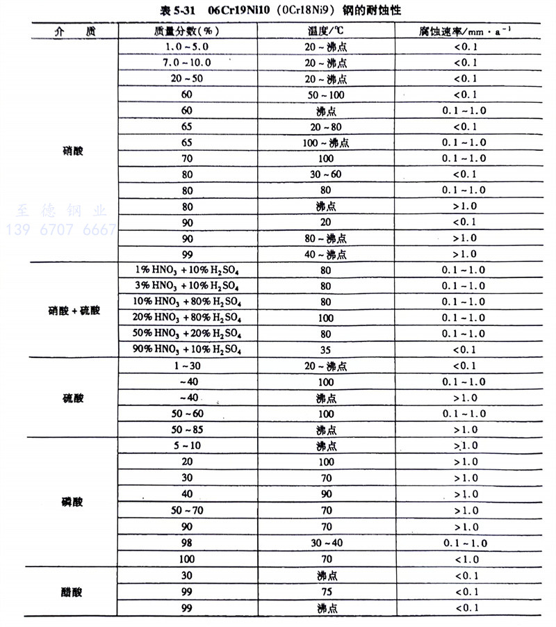 (7)耐蝕性: 06Cr19Ni10 、0Cr18Ni9、1.4301、S30408、304不銹鋼的耐蝕性見表5-31。