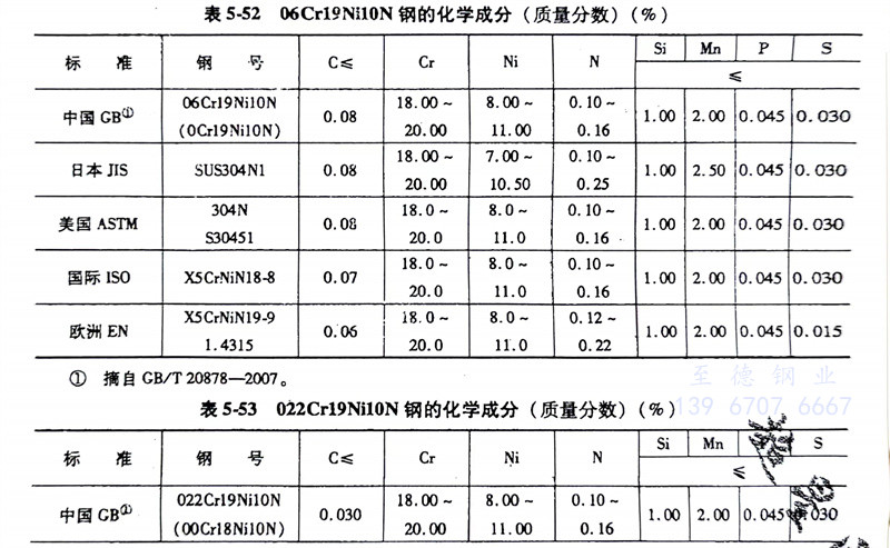 (1)化學成(cheng)分: 06Cr19Ni10N 鋼(gang)和022Cr19Ni10N不銹鋼(gang)的化學(xue)成分(fen)見表5-52和表5-53。