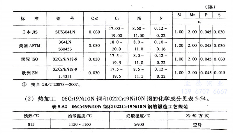 (2)熱(re)加工: 06Cr19Ni10N鋼和022Cr19Ni10N不銹鋼的化學成分見表5-54。